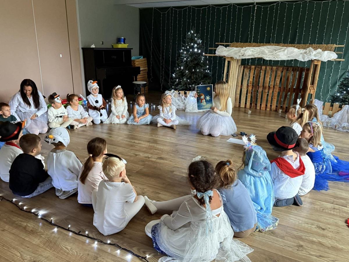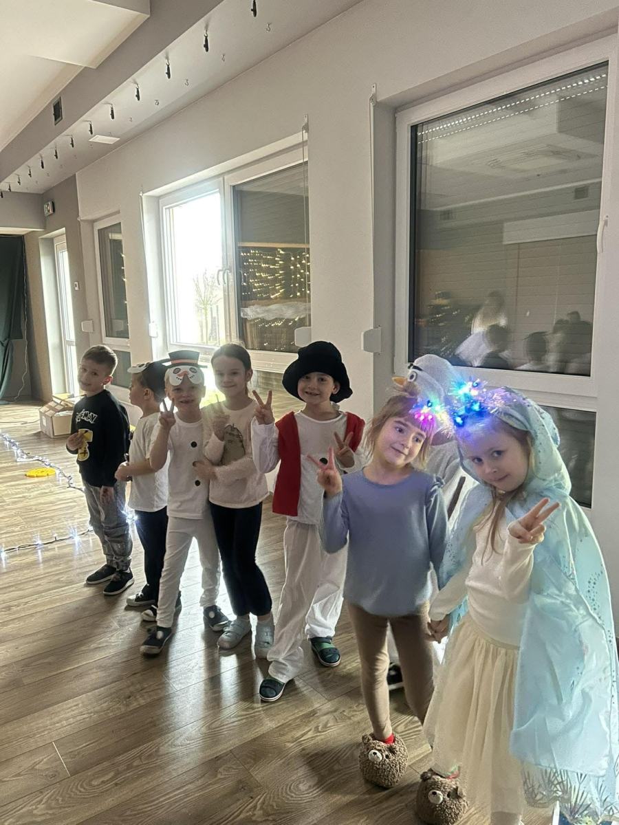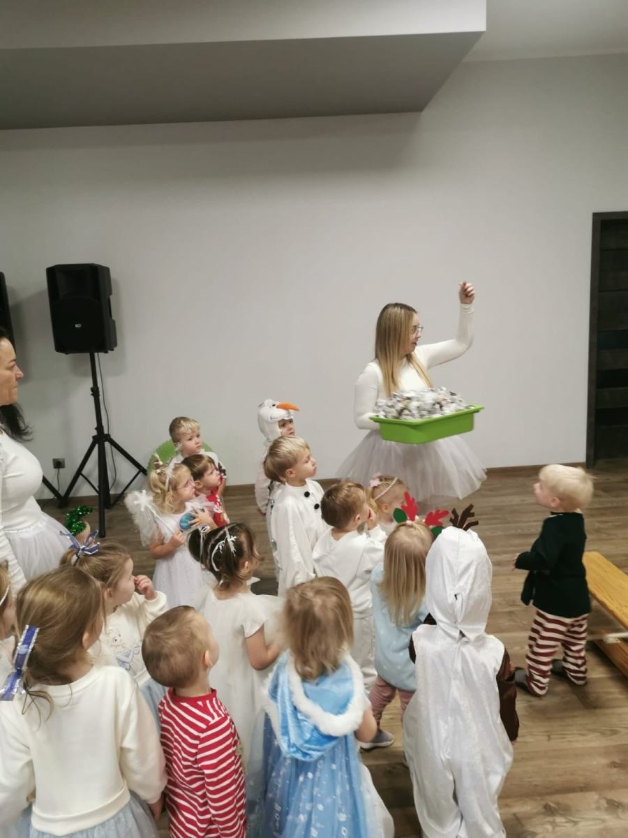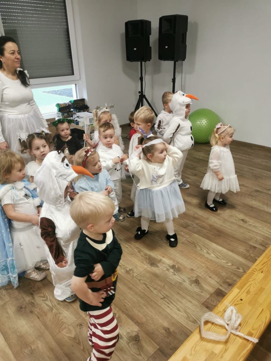 Bal mikołajkowy przeniósł dzieci do magicznej, zimowej krainy pełnej śnieżynek i wesołych bałwanków. Sala wypełniła się radością, śmiechem i świątecznym nastrojem. Dzieci z entuzjazmem brały udział w zimowych zabawach – była bitwa na śnieżki, toczenie śnieżnych kul oraz wspólne tańce i animacje.